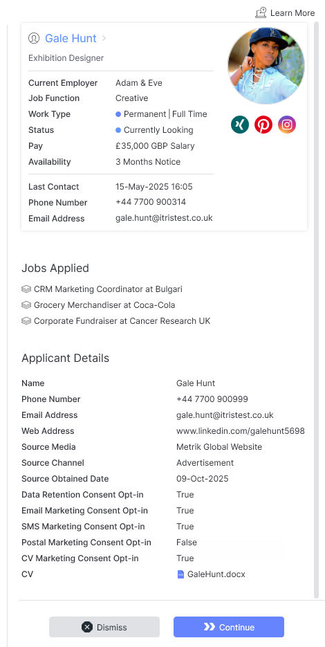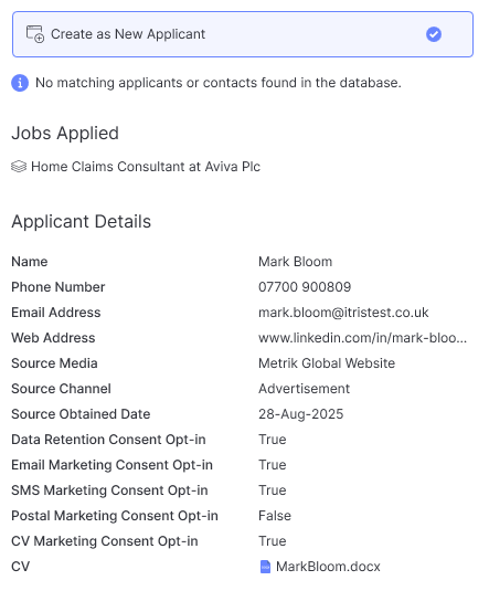 Depending on the scenario these details may include possible matching existing records (both applicant and contact), record cards of applicants matched (by the itris record ID number), details of jobs applied to during the registration process, the applicant’s email address and CV.