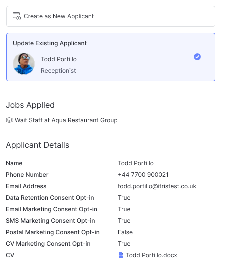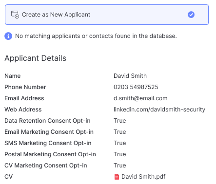 Depending on which option is selected (Create as New Applicant or Update Existing Applicant) either the New Applicant form will be loaded which will be prepopulated with the data provided via the entry and, if enabled, be Daxtra CV Parsed, or the Applicant Update Utility will open as per the example above.