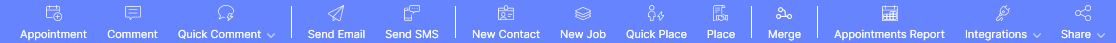 Each record type in itris has an action bar with actions relevant to the record type. On the company record, this includes creating new appointments and comments, sending emails, creating new contacts or jobs and placing applicants into a job. Please see the following articles for further information: New Appointments, Comments, Quick Comments, New Email Form, Using SMS, New Contact, New Job, Quick Placements, New Placement, Merging Records | Companies, Appointments Report, Posting to Integrations and Record Sharing.