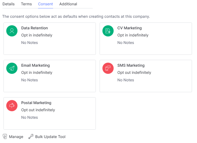 The consent tab is where you can set the default Retention and Marketing Preferences for contacts created against this company, and use the Bulk Update Tool to change these preferences on existing contacts.