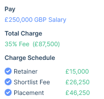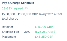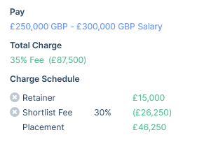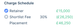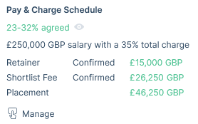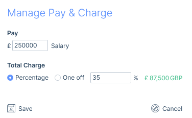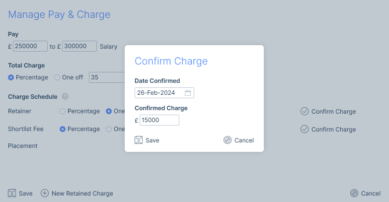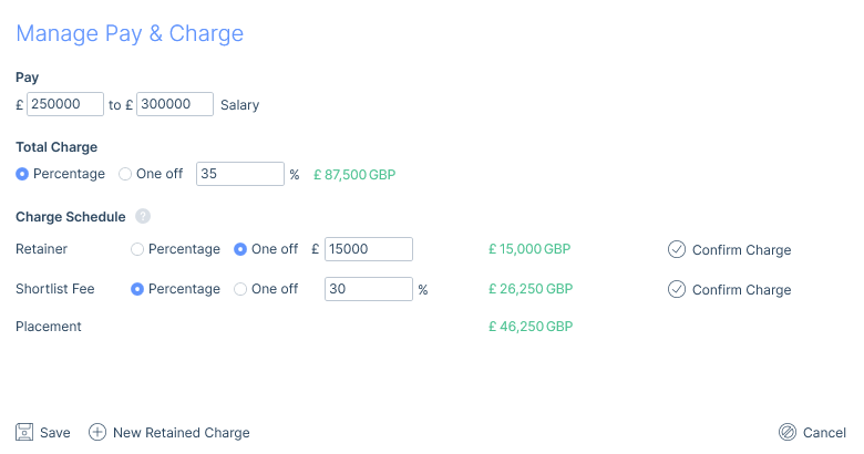 The Pay and Charge Schedule is where you will add the expected Pay range, Total Charge and the Charge Schedule. This is initially added in the new job form but can be amended on the Job Record if necessary. For Permanent jobs, the Total Charge can be either a percentage or One off fee, but for any retained Contract or Temporary jobs, this will be a One off fee.