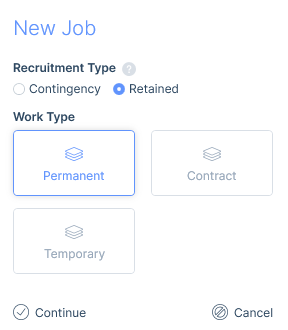 At the point of creating a new job, you are able to select it as a Retained job. All work types can be created as a Retained job, however, for Contract and Temp Retained jobs the charge options will be restricted to a One off (Fixed) Fee. Additionally, unlike Contingency jobs a Retained job will be restricted to one role.
