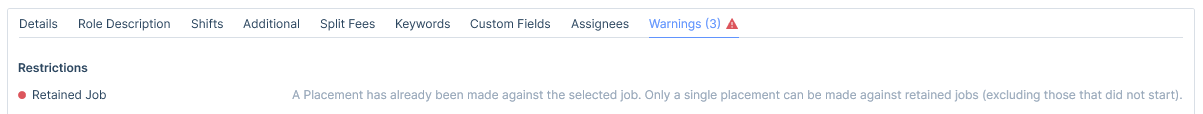 If you attempt to make a placement against a Retained Job that already has a placement against it you will receive a Warning in the New Placement Form.