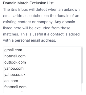 Without exclusions, every person emailing you from Gmail could be incorrectly suggested as a new contact at whichever company in itris also has a Gmail address on file.
