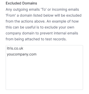 ✓ Use Excluded Domains to stop internal emails being logged against your own team’s test records in itris.